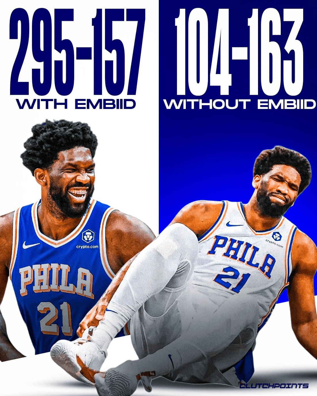 🔹 恩比德缺阵时,76人战绩:104胜163负